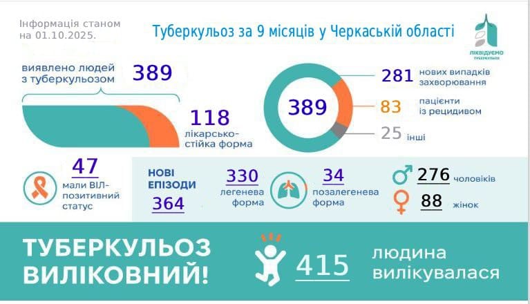 :За 9 місяців 2025 року в Черкаській області зареєстровано 389 людей з туберкульозом (ТБ)