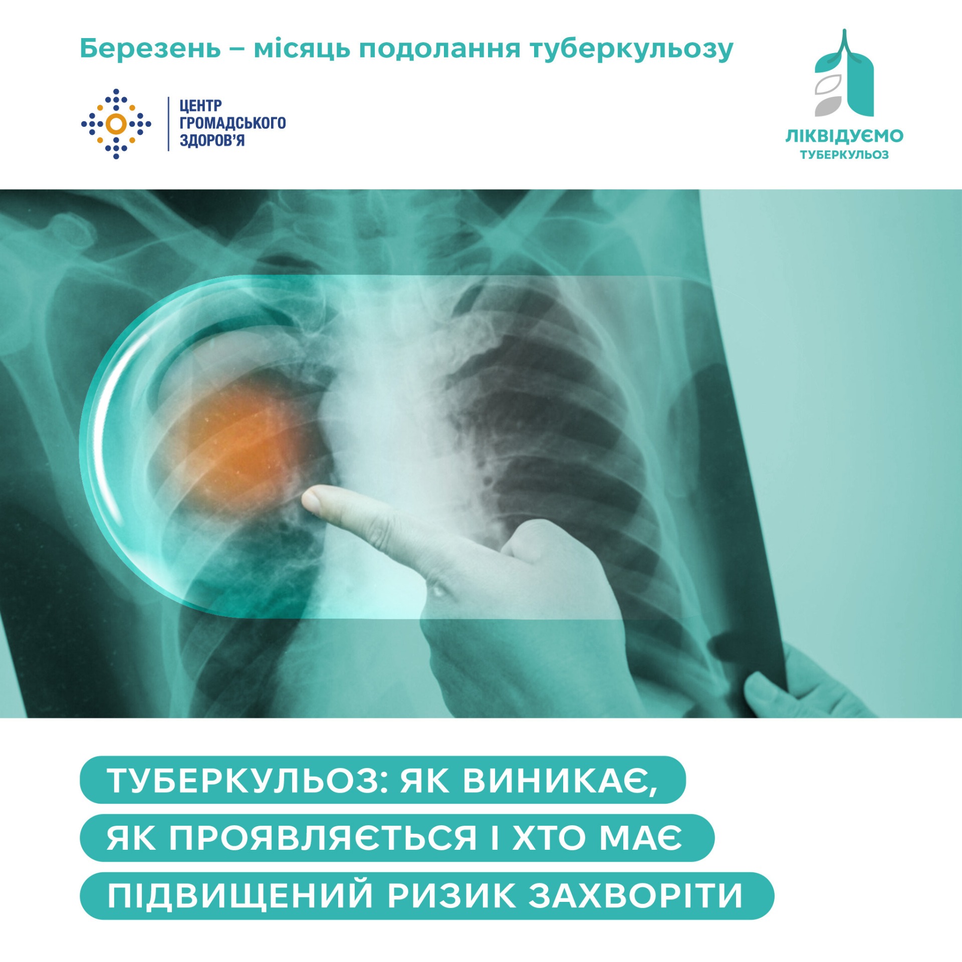 Туберкульоз – інфекційне бактеріальне захворювання, яке передається повітряно-крапельним шляхом. У більшості випадків вражає легені. Але може пошкодити нирки, хребет, мозок, лімфатичні вузли, травний тракт, шкіру чи статеві органи. Початок захворювання поступовий та може розтягнутися на кілька тижнів, а інколи – місяців. Туберкульоз виліковний, якщо вчасно звернутися за медичною допомогою.